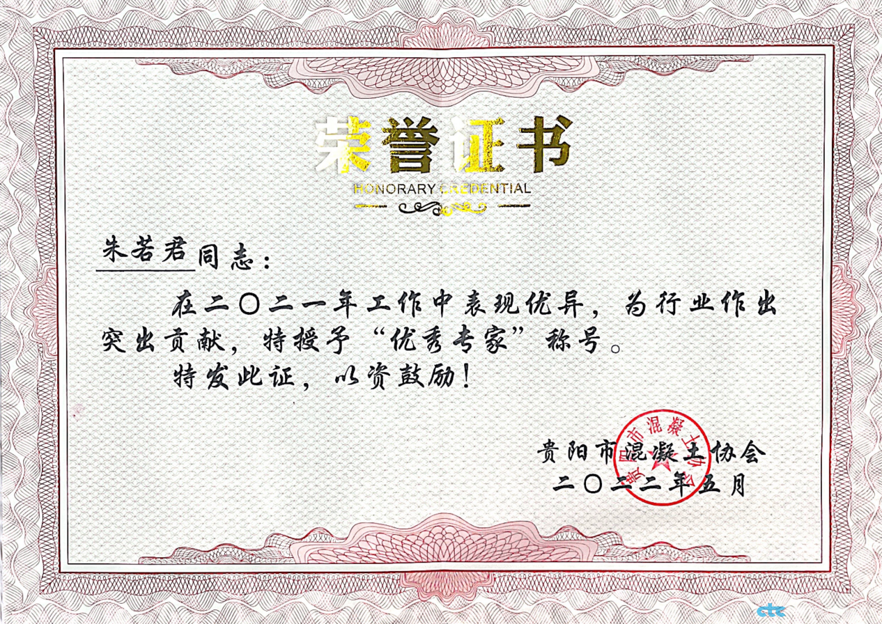 國檢集團(tuán)貴州公司員工榮獲貴陽市混凝土協(xié)會(huì)授予的 “2021年度優(yōu)秀專家”榮譽(yù)稱號(hào)